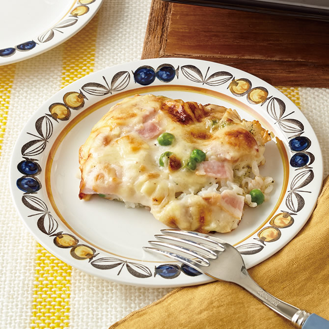 深皿にオリーブ油(分量外)をぬり、ごはん・バター・乾燥パセリを入れてよく混ぜ、全体に広げる。