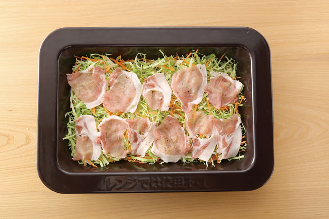 深皿にキャベツ・にんじんを入れ、豚肉が重ならないように並べ、肉に酒をふる。