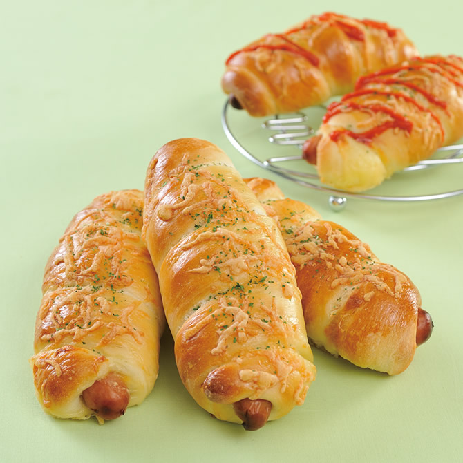 * 生地をソーセージの真ん中にかぶせて押さえ、巻いていくと巻きやすくなります。