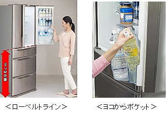 ユニバーサルデザインの観点から、冷蔵室の底面を低く設計することで、ペットボトルなどの重い食品も取り出しやすくなっています。また、ドア内側形状の工夫によりドアポケット後列のペットボトルも出し入れが容易になっています。