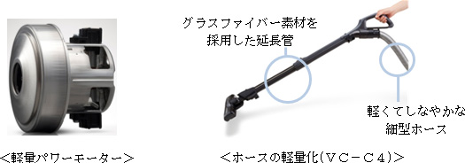 新製品は、新型軽量モーターの採用により、本体質量注2が従来機種 (VC-C3)より約100G軽い2. 2kgの軽量コンパクトボディです。さらに、ホースの径を細くしたことで、標準質量注3は、従来機種より約200G軽い3. 6KGです。また、耐久性が求められる素材に幅広く採用されているグラスファイバー素材を延長管に採用しています。