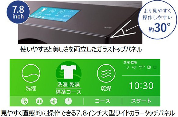 ![7.8inch、自動2度洗いコース[がんこ汚れモード]、より見やすく操作しやすい約30℃。見やすく直感的に操作できる7.8インチ大型ワイドカラータッチパネル。](/sites/default/files/2021-08/press_2021_08_05_1447_img_07.jpg)