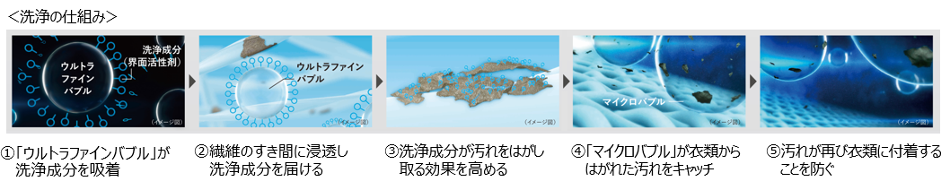 また、好評の「ウルトラファインバブル洗浄EX」を、引き続き搭載。水道水がファインバブル発生装置を通過することで、「ウルトラファインバブル」と「マイクロバブル」を含んだ水に変化し、洗剤の洗浄効果を高めます。「ウルトラファインバブル」は目に見えないナノサイズの泡で、洗剤の洗浄成分を吸着して繊維の奥に入り込み、皮脂汚れを落とすことで、衣類の黄ばみを予防。「マイクロバブル」は、「ウルトラファインバブル」がはがし取った汚れを吸着し、衣類から引き離すことで、黒ずみを防ぎます。この2種類の微細な泡の効果を活用した「バブルdeメンテ」は、洗濯のたびに洗濯槽への汚れ付着を抑制し、従来1〜2か月に1回程度必要とされていた槽洗浄が、3〜4か月に1回で済むためお手入れの手間が軽減します注1。