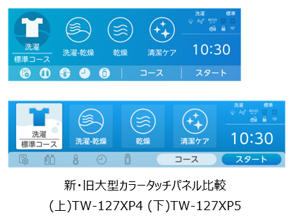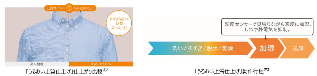 - 注2【「うるおい上質仕上げ」仕上がり比較について】●カジュアルシャツ(綿100%/防しわ加工ナシ)●当社2021年度従来機種TW-95GM1(ヒーター式乾燥/湿度センサー非搭載/標準コース3kg洗濯~乾燥時)とTW-127XP5(ヒートポンプ式乾燥/湿度センサー搭載機/標準コース3kg洗濯~乾燥・乾燥お急ぎ+うるおい上質仕上げ時)の比較。