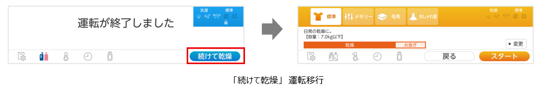 業界トップクラス注5の7.8インチの液晶タッチパネルは、さらに大きく見やすい9.2インチの新大型カラータッチパネルへ改良しました注6。より大きなワイド画面で多くの情報を一画面に表示し、洗練されたレイアウトでわかりやすく整理しています。コースや運転情報が一段と見やすくなり、視認性が向上しました。また、洗濯に関わる設定変更や一画面に収まらないコースの概要説明などの情報もスワイプ操作でスクロール表示でき、直感的に操作できます。さらに、特許取得済の独自機能である「続けて乾燥運転」を搭載しており、洗濯終了後に電源を切ることなくワンタッチで乾燥運転に移行できます。洗濯後に一部の衣類を取り出し、残りを乾燥させたいというユーザーのニーズに応じて便利にご利用いただけます。