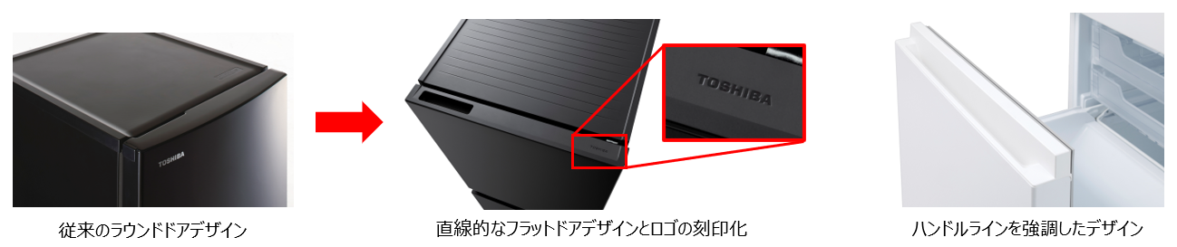 新製品では、従来のラウンド形状(ドア)から、直線的なフォルムのフラットドアへと刷新。加えて、前面に表示していたロゴを、ハンドル上部への刻印に変更。冷凍室のハンドルも、当社大型冷蔵庫の直線的な意匠を踏襲することで、よりシンプルで上品な外観に仕上げました。