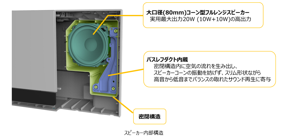 新製品は、置き場所に困らない奥行95mm※2の縦型スリム形状。スタイリッシュなデザインでありながら、大口径スピーカーおよびバスレフダクトを内蔵し、高音から低音までバランスの取れた自然な音質を実現しました。