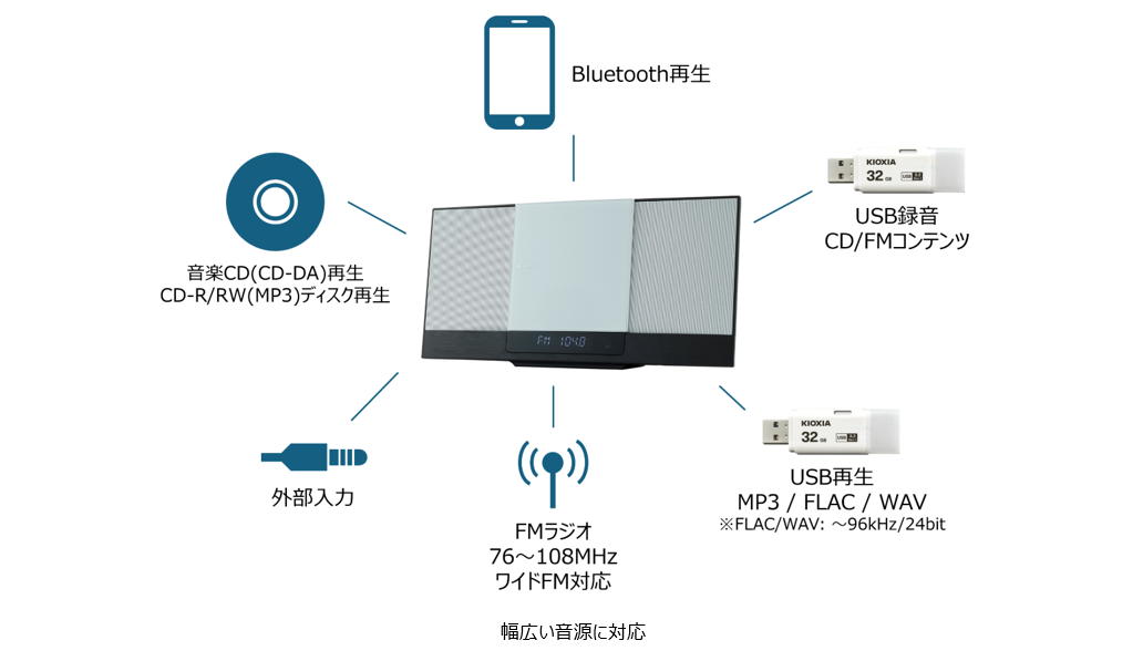 CD、Bluetooth、USB、外部入力、FMラジオなど幅広い音源の再生に対応しています。CD再生では、一般的な音楽CDフォーマット(CD-DA)に加え、MP3フォーマットのCD-R/RWディスクにも対応。さらにUSB再生では、MP3だけでなく、FLAC*やWAV*フォーマットにも対応しており、さまざまな音源で音楽を楽しむことができます。さらに、CDやFMラジオのコンテンツをUSBメモリに録音することも可能です。