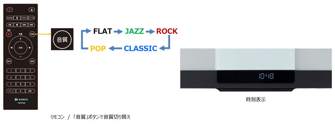 ・リモコンの「音質」ボタンで、お好みの音質を選択できます。(FLAT/JAZZ/ROCK/CLASSIC/POP)
