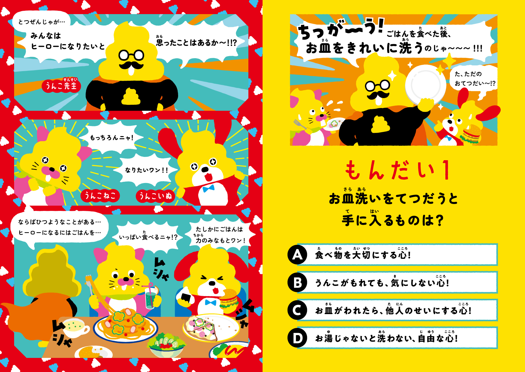 物語は、うんこ先生の「ヒーローになりたいと思ったことはあるか〜!!??」という藪から棒なセリフから始まります。お皿洗い、洗濯、冷蔵庫の整理、トイレ掃除——。それぞれのおてつだいを通して、「食べ物を大切にする心」「人を気づかう心」「電気を大切にする心」「助け合う心」など、くらしに必要な“ヒーローの心”を学びます。
