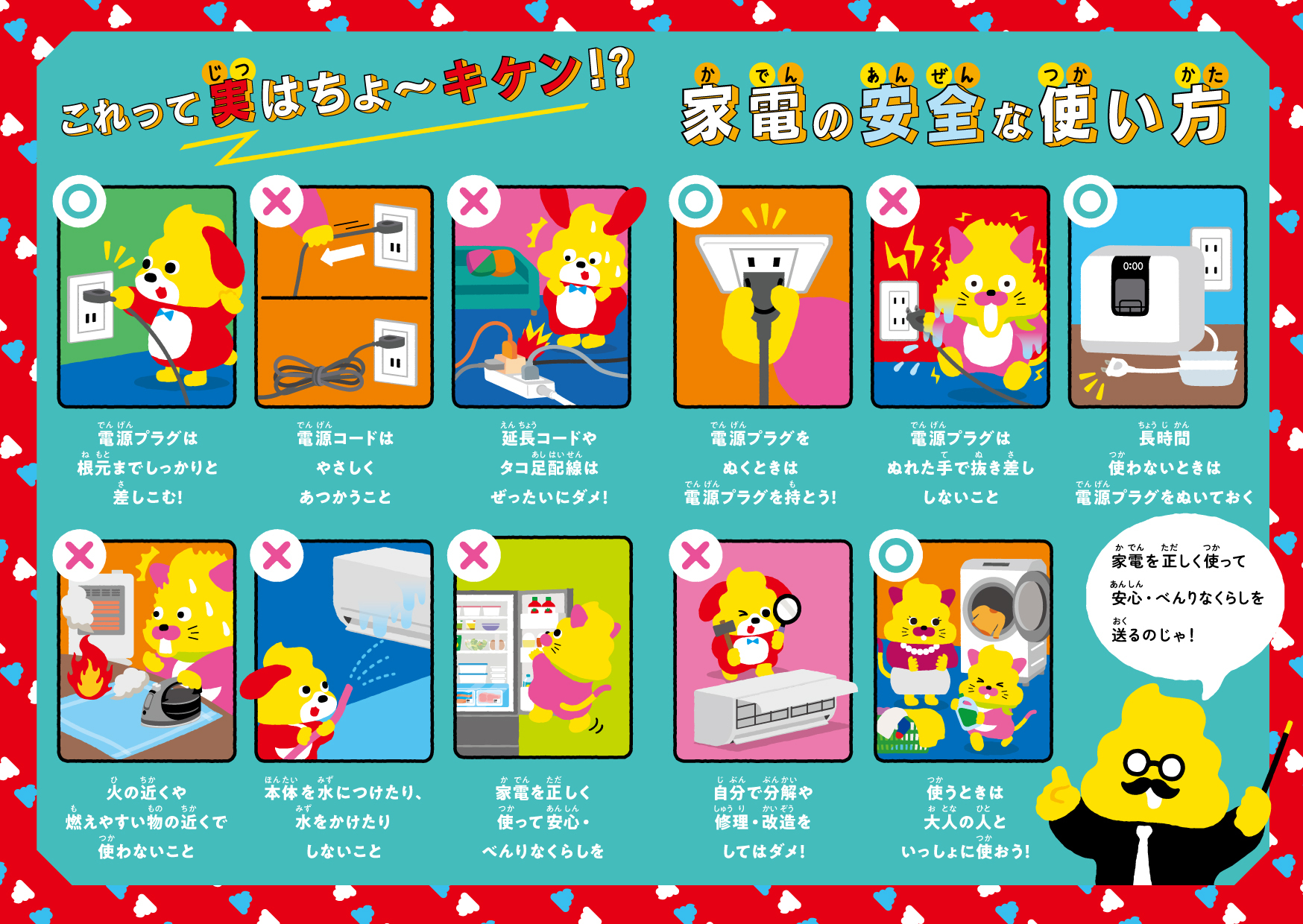 最後のページでは、「これって実はちょ〜キケン!?」をテーマに、家電を安全に使うためのポイントをうんこ先生たちが徹底チェック!ユーモアあふれるイラストの中に、実は大切なヒントがたくさん。電源プラグの扱い方、水まわりや火のそばでの注意など、日常の中に潜む“あぶない!”を楽しく学べる構成です。