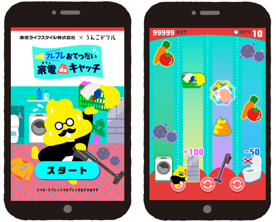 プレイヤーは、洗濯機・冷蔵庫・掃除機・トイレを操作し、画面上から落ちてくる「洗濯物」「野菜」「ホコリ」「うんこ」を正しい家電でキャッチします。正解するとスコアアップ!遊びながら家電の役割や正しい使い方を自然と学べる構成になっています。
