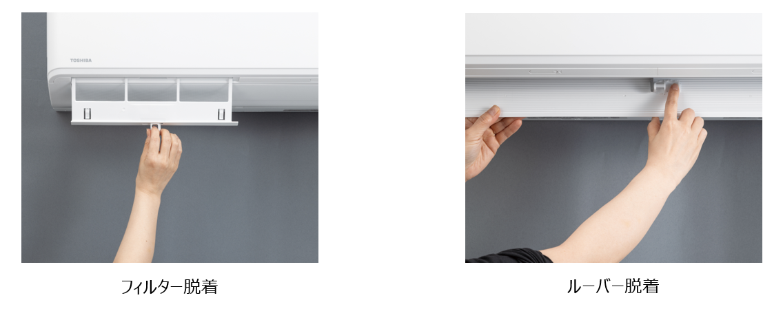 清掃作業の手間を軽減するため、室内機のエアフィルターをワンタッチで脱着できる新構造を開発。前面パネルの開閉や作業台などでの高所作業を不要※3とし、フィルター清掃にかかる作業時間を約1/10に短縮しました※4。汚れやすいルーバーについてもワンタッチで脱着できる新構造を開発し、お手入れの利便性が大きく向上しました。