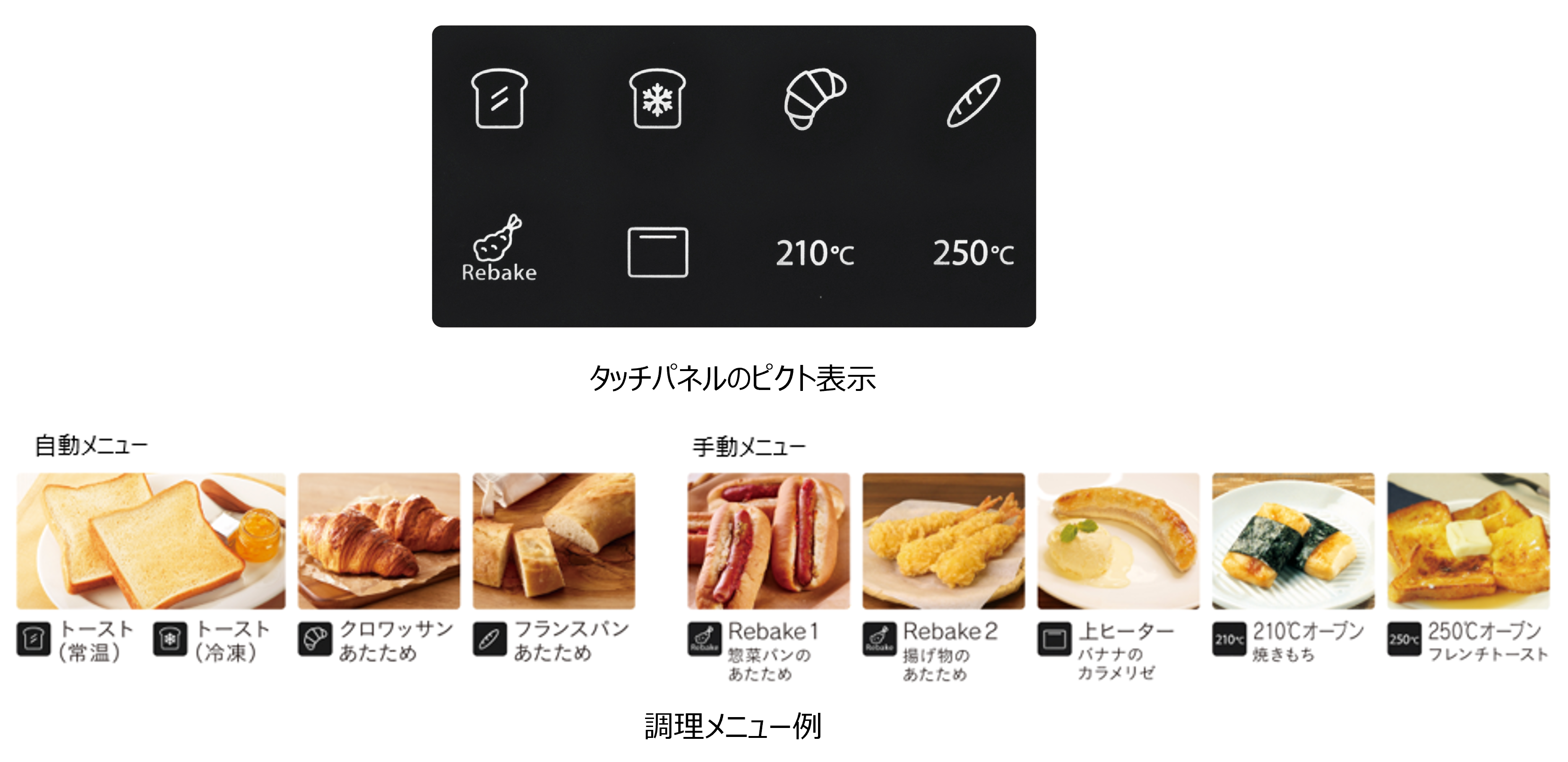 2. ワンタッチで焼き上げる4つの自動メニューと惣菜パンや揚げ物などをあたためるリベイクメニューを搭載