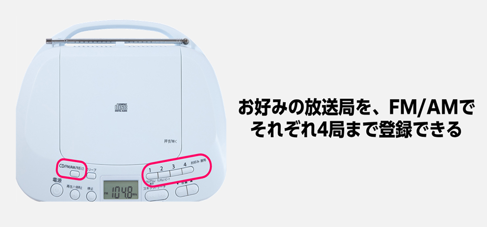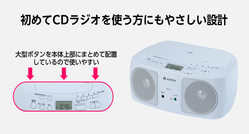 | 電池持続時間* | 東芝アルカリ乾電池単2形×6本使用時 ラジオ受信時:約40時間 CD再生時:約20時間 | ||