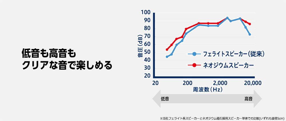 スピーカーの性能を左右する磁石に、フェライト磁石の10倍以上の磁力をもつネオジウム磁石を採用。高能率化とともに、入力信号に対するスピーカーのレスポンスが向上しました。ネオジウムスピーカーは従来のフェライトスピーカーに比べて入力への反応が早く、透明感のある音質となり、原音の再現性が高くなります。また、独自構造のスピーカー振動板やセンターキャップなどにより、厚みのある音質に仕上げました。縦型スリムでコンパクトな外観ながらに、臨場感のある高音質を楽しめます。