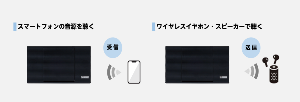 スマートフォンの音源を送信して聴く受信機能だけでなく、TY-CR80で再生した音源をお手持ちのBluetooth®イヤホン・スピーカーへ送信して聴くこともできます。 Bluetooth®送信機能は、ラジオ放送を聴くときにも使えるので、電波の届きにくい室内でAMラジオを聴く場合、受信レベルの良い窓際などにラジオ本体を置いてBluetooth®スピーカーへ送信すれば、室内の好きな場所で雑音の少ないクリアな音のラジオ放送を聞くことができます。