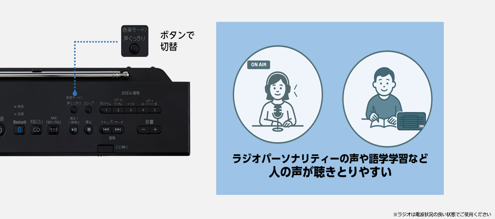 「声くっきり機能」※を搭載。ラジオのパーソナリティーの声や語学学習のリスニングなど、人の声がはっきり聴こえます。