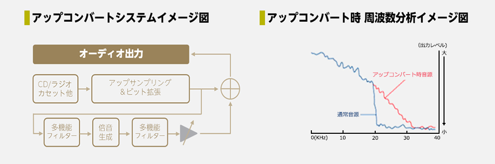 CDやMP3などの圧縮音源をハイレゾ音源相当の高解像度音質に変換するアップコンバート機能を搭載。原音から倍音成分を生成し、生成した倍音をフィルター処理を施すことによりナチュラルに減衰。それを再度原音に戻すことであたかも最初から20kHz以上のプレゼンス情報があったかのように高解像度化します。CDやMP3だけではなくラジオやカセットテープの音源もハイレゾ相当に変換。いつも聴いている音楽が、いままでとは違う鮮明で躍動感あふれるナチュラルな音質でよみがえります。