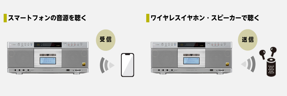 スマートフォンやポータブルプレーヤーから送信されたBluetooth®音源を受信して聴けるほか、本体で再生したカセットテープ、CD、SD、USB、外部入力音源、AM/FMラジオの音をワイヤレスイヤホン等のBluetooth®対応機器へ送信して聴くことができます。たとえば、電波の届きにくい室内でラジオを聴く場合、受信レベルの良い窓際等に本体を置いてBluetooth®送信すると、室内の好きな場所で雑音の少ないクリアな音のラジオ放送をお手持ちのBluetooth®スピーカーで楽しめます。