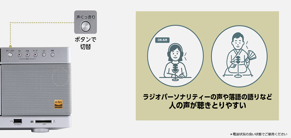 「声くっきり機能」※を搭載。ラジオのパーソナリティーの声や落語の語りなどがはっきり聴こえます。