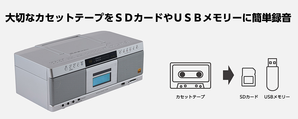 お気に入りのカセットテープの音源を、SDカードやUSBメモリーに簡単に録音して手軽にデジタル化できます。