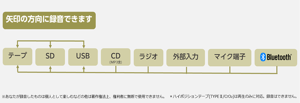 テープへの録音はもちろん、SDカードやUSBメモリーへの録音や、CD(MP3を含む)からSDカード、USBメモリーへの倍速録音にも対応しています。また、スマートフォンや音楽プレーヤーなどの音源もBluetooth®で手軽にSDやUSBに簡単に録音ができます。