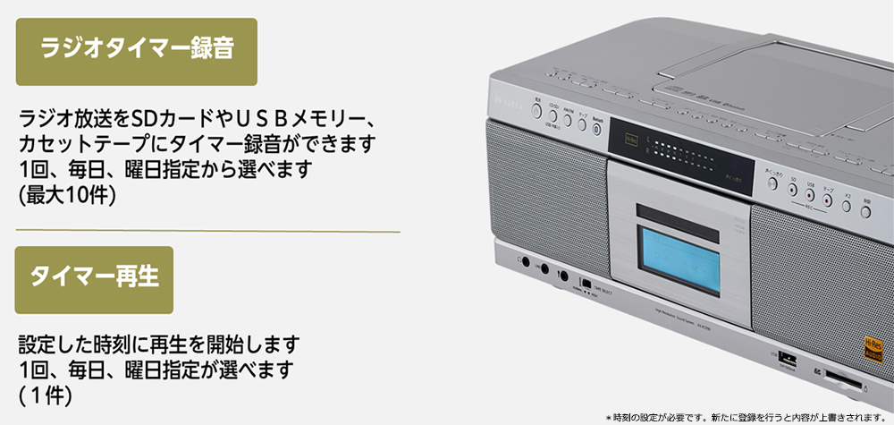 電池持続時間* | 東芝単2形アルカリ乾電池使用時 CD/Bluetooth®再生時:約9時間 ラジオ受信時:約12時間 テープ再生時:約9時間 SD再生時:約11時間 USB再生時:約10時間 | ||