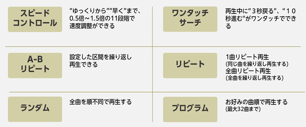 入出力端子 | 外部入力:φ3.5mmステレオミニジャック マイク入力:φ3.5mmモノラルミニジャック ヘッドホン出力:φ3.5mmステレオミニジャック SDカード挿入口:SD規格に準拠した入力端子 USBメモリー挿入口:USB1.1、USB2.0、DC5V 0.5A | ||
