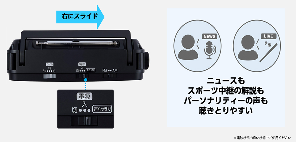 ホームラジオに「声くっきり機能※」を搭載。ニュース番組などしっかり人の声を聴きたい場合などにスライドして切り替えることで、人の声がくっきり聴こえます。