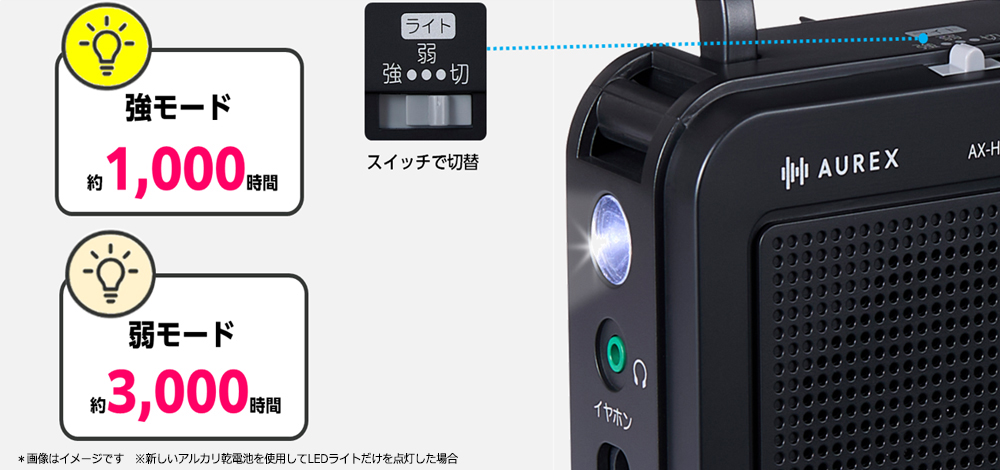 電池持続時間※1 | 東芝アルカリ乾電池(単1形乾電池×3本)(別売) 内蔵スピーカー使用時* FM受信:約400時間 AM受信:約450時間 LEDライト点灯時間:(強)点灯時間:約1,000時間/(弱)点灯時間:約3,000時間 | |