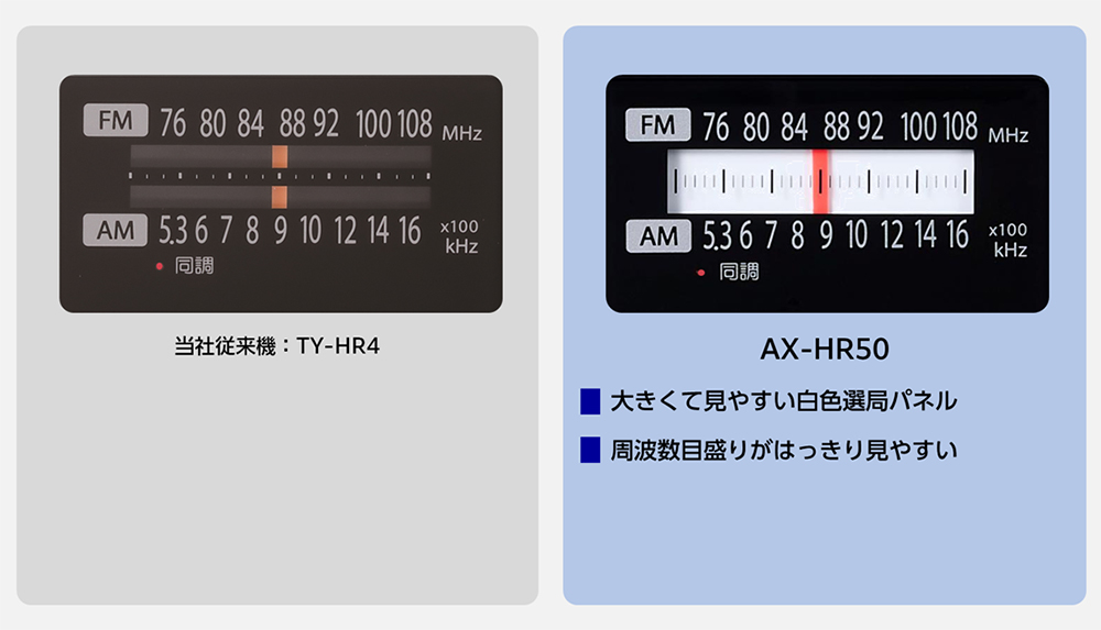 デジタルチューナー搭載でピタッとかんたん選局。選局できると同調ランプが点灯するので合わせやすく、大きめの選局パネルで周波数表示もさらに見やすくなりました。