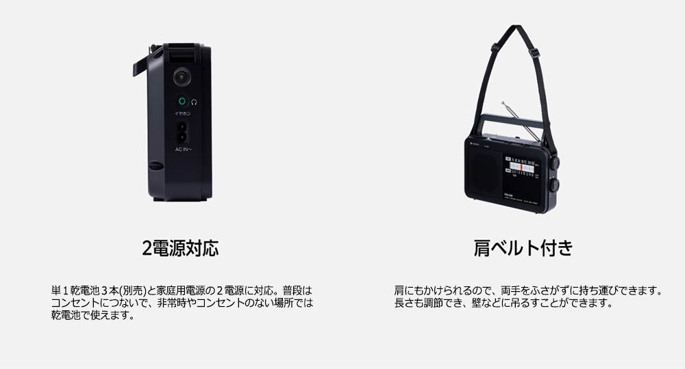 FM放送受信で最大約400時間、AM放送受信で最大約450時間の連続使用が可能。毎日のラジオライフを、長く快適に楽しめます。非常時でも安心してご使用いただけます。