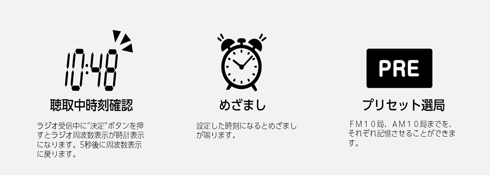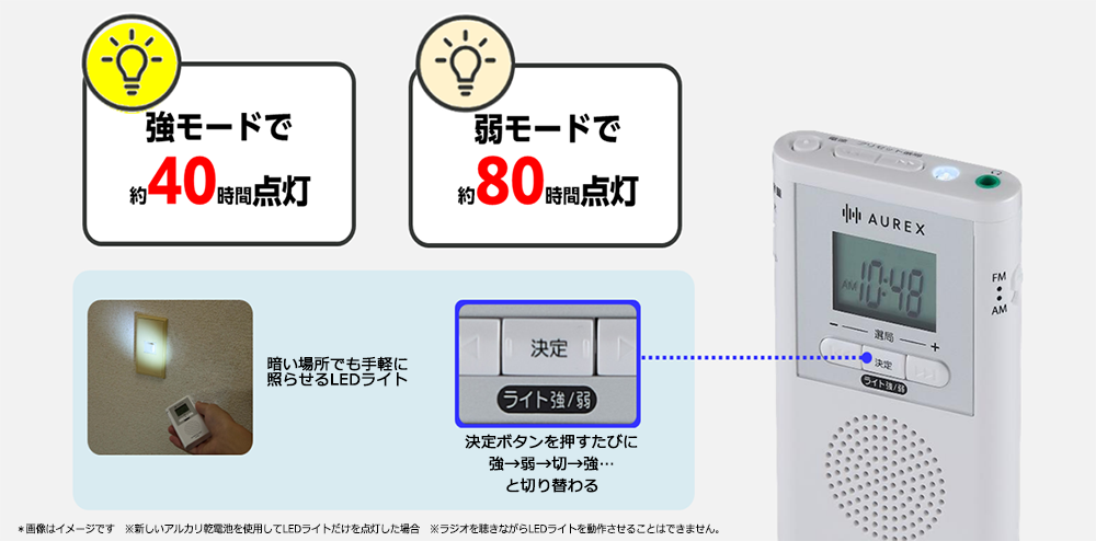 | 電池持続時間※1 | 東芝アルカリ乾電池(単4形乾電池×2本)(別売) イヤホン使用時 FM受信:約50時間 AM受信:約60時間 内蔵スピーカー使用時 FM受信:約35時間 AM受信:約45時間 LEDライト点灯時間:(強)点灯時間:約40時間/(弱)点灯時間:約80時間 | |