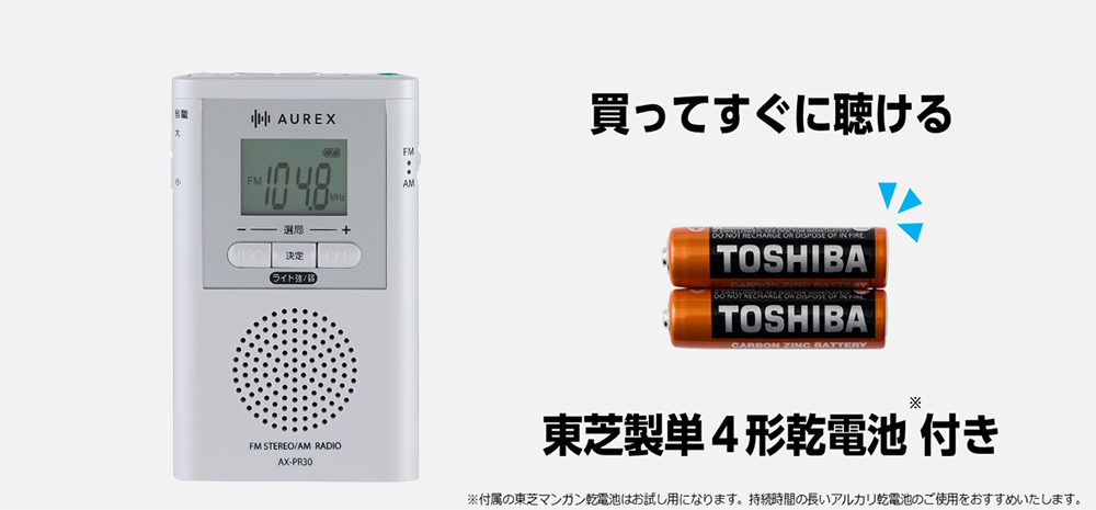 東芝製単4形乾電池(マンガン乾電池)が付いているので、すぐにラジオをお使いになれます。