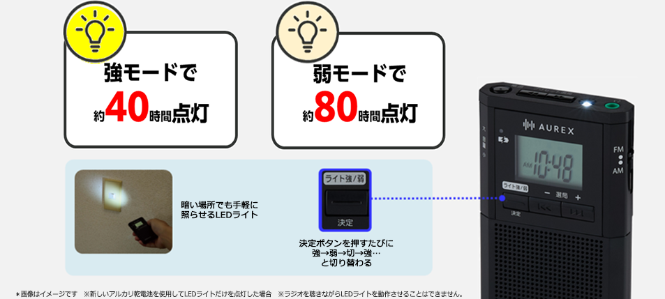 長時間LEDライト搭載。USB充電と乾電池のどちらでも使えるLEDライト付きポケットラジオ