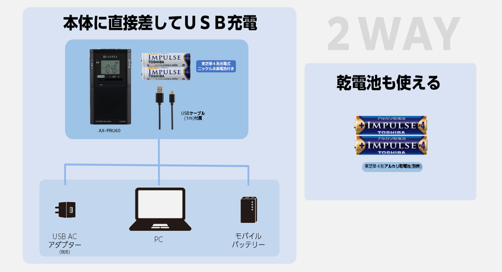 PCやモバイルバッテリーからの充電も可能なUSB Type-C充電を採用。同梱の充電式ニッケル水素電池を使用した場合、イヤホン使用時FM受信で約32時間、AM受信で約38時間動作します。さらに、乾電池でも動作するので、外出時の不意な電池切れも安心です。