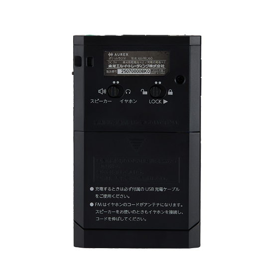 | 付属品 | ステレオイヤホン、イヤーピース(S、M※2・L)×1ペアー、単4形東芝充電式ニッケル水素電池2本、USB充電ケーブル(コード長1m)、保証書付取扱説明書 |