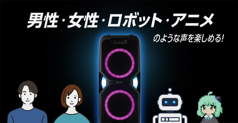 本機をマイク(別売)に接続してマイクボイス変換機能を設定すると4パターンの声に変換します。パーティーやイベント、カラオケなど幅広いシーンでお楽しみいただけます。