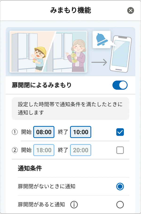 設定した時間帯の扉開閉をお知らせします。外出先からお子さまの帰宅を確認したり、離れて暮らすご家族の見守りにもお使いいただけます。