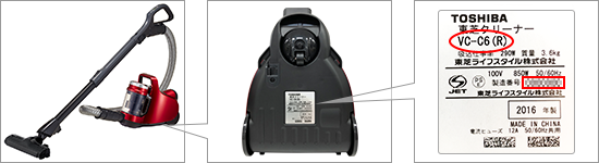 掃除機本体の裏面に貼られている銘板シールに記載されています。形名は、「VC-」からはじまります。